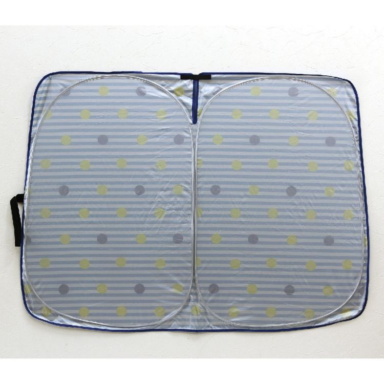 ※image photo SPICE OF LIFE くるりん折りたたみカーサンシェード ドット×ボーダー 大型車用136×102cm ワンタッチでくるっと簡単開閉!コンパクトに収納できる折りたたみカーサンシェード ■車内の温度上昇を軽減させ紫外線による内装劣化を防止!■ポン!と簡単に広げて装着でき、使用後はくるっと小さくまとめられるのでドアポケットなどにかさばらず収納できます。