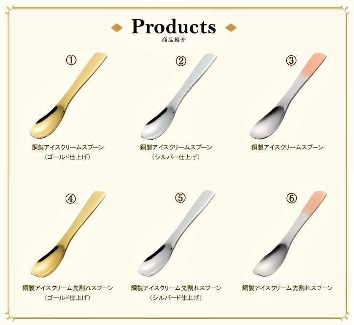 銅製アイススプーン - ペアセット ■寸法:長さ124 × 幅27 × 厚さ5(mm) ■材質:純銅 ■仕上げ:金メッキ、銀メッキ、錫塗り ■装丁:化粧箱 ■製造:日本製 新潟県燕市 新潟、燕で昭和34年からこの道一筋。